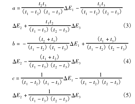 a、b和c三個系數由每支熱電偶在三個分度點上測得的熱電勢(可由溯源證書得知)代入式(2)解-組三元一次聯立方程求得,其推導公式分別如式(3)~式(5)所示: