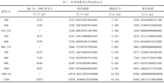 從表1可知,軟件給出的各溫度點參考函數均能通過數字修約規則“四舍六入,逢五取偶”得到JJG75-1995《標準鉑銠10-鉑熱電偶檢定規程》附錄2鉑銠10-鉑熱電偶(S型)參考函數(除鋅、鋁和銅凝固點對應的參考函數外,因為規程未給出數值)。