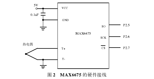 為了解決上述K型熱電偶在實際使用中的問題,系統選用熱電偶數字轉換芯片MAX6675作為模數轉換器。MAX6675是美國MAXIM公司生產的一種串行K型熱電偶模數轉換器,其具有冷端補償、線性校正、熱電偶斷線檢測等功能[5],可直接將K型熱電偶模擬信號轉換為數字信號。MAX6675芯片的精度為12位,溫度分辨能力為0.25℃.冷端補償范圍為-20~+85℃,工作電壓為3.0V~5.5V。當熱電偶冷端的溫度變化時,MAX6675可通過內置的冷端補償電路來進行溫度補償和修正,同時MAX6675內部集成的非線性校正電路、斷線檢測電路、信號放大電路都可以很好地解決K型熱電偶在實際使用中的問題,滿足工業溫度測量控制的要求。MAX6675的硬件接線如圖2所示。MAX6675的T+端接K型熱電偶正極,T-端接K型熱電偶負極;SO為轉換后的串行數據輸出端,與單片機的P2.5端口相連,由該端口將數據送入單片機進一步處理;SCK為串行時鐘輸入端,接入單片機的P2.6端口,由單片機提供控制脈沖時鐘信號;CS為片選端口,低電平有效,接入單片機P2.7口,單片機輸出低電平使能串行接口后,可在SO引腳上讀取數據。MAX6675的工作電源為5V,在電源端附近放置一個0.1μF的陶瓷電容,可減少電源耦合噪聲的影響,提高測量的精度。