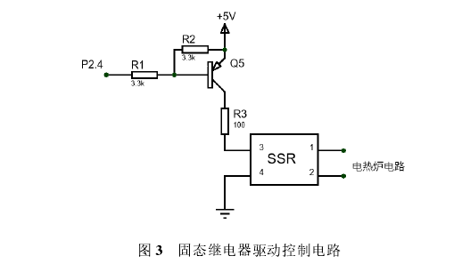 由于系統研究的控制對象為電熱爐,為大電壓負載,單片機需要控制電熱爐加熱模塊的電路通斷,因此設計繼電器驅動控制輸出電路實現。系統控制選用歐姆龍G3MB交流固態繼電器(SSR),固態繼電器是一種沒有機械運動、不含運動零件的繼電器,其特點是全部由固態電子元件組成的無觸點開關元件,利用電子元器件的電磁和光特性來完成輸入和輸出的可靠隔離,利用大功率三極管、功率場效應管、單向可控硅和雙向可控硅等器件的開關特性,來達到無觸點、無火花接通和斷開被控電路[7]。固態繼電器具有壽命長、可靠性高、靈敏度高、轉換快速、電磁干擾少等優點。圖3為固態繼電器的驅動控制電路,固態繼電器的3引腳、4引腳為輸入控制端,1引腳、2引腳為輸出端。圖中單片機P2.4口為控制信號輸出口,連接到晶體三極管基極,固態繼電器的輸入控制端連接到晶體三極管,當單片機P2.4口輸出低電平控制信號時,晶體三極管導通,固態繼電器SSR通電,輸出端1、輸出端2從斷態轉變為通態,接通電熱爐電路。
