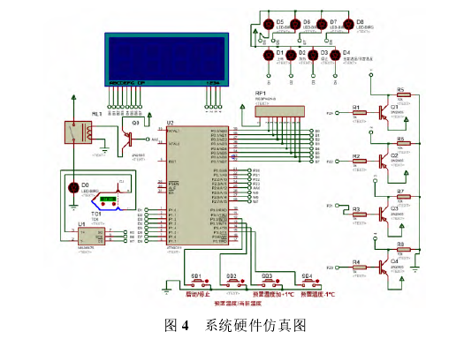 圖4為熱電偶溫度控制系統的硬件仿真原理圖。其中按.鍵輸入設置4個按鍵SB1、SB2、SB3、SB4。SB1為加熱啟動/加熱停止的轉換控制按鍵,SB2為顯示當前溫度/顯示預置溫度轉換控制按鍵,SB3為預置溫度加1"C控制,SB4為預置溫度減1"C設置。當系統啟動時,可按下按鍵SB3和SB4,單片機執行相應的加一和減一程序功能,設定溫度預置值。圖中單片機的P2.4口連接三極管和繼電器電路,用來發出控制信號通斷加熱裝置;系統設計了8個LED燈指示電路,通過單片機的P1口進行控制,當系統運行時指示系統的各種狀態。采用四位數碼管顯示屏實時顯示溫度測量信號,測量信號由單片機PO口輸出,數碼管位選端由單片機P2.0、P2.1、P2.2和P2.3經三極管驅動控制,實現動態顯示。