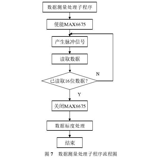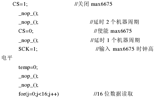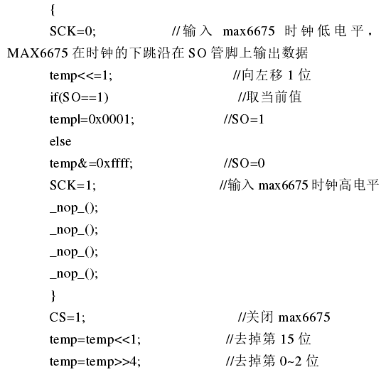 溫度控制系統的數據測量處理子程序流程圖如7所示。系統啟動測溫時,單片機將MAX6675芯片引腳CS由初始化狀態變換為低電平,使能MAX6675芯片,停止轉換數據,同時在SCK引腳上輸入高電平脈沖信號,等待讀取SO引腳中的測量輸出數據。當SCK引腳輸出低電平,脈沖信號出現下降沿時,SO引腳上輸出一位數據,單片機循環產生16個脈沖信號,分別輸出16位測量數據。MAX6675讀取數據的相關程序段如下: