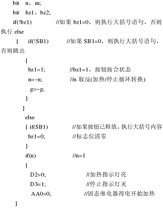 系統設置了4個功能按鍵SB1、SB2、SB3、SB4,采用定時中斷掃描檢測各個按鍵輸入信號。系統將SB1設定為一鍵控制加熱啟動和加熱停止的功能,因此定義位變量.n,n=1時代表開始加熱狀態,n=0時代表開始停止加熱狀態,加熱啟動后,不能更改預置溫度。SB2設定一鍵控制顯示當前溫度和顯示預置溫度功能,定義位變量m表示狀態,m=1顯示預置溫度狀態,m=0顯示當前溫度狀態。另外定義位變量bz1、bz2分別表示SB1、SB2閉合斷開的標志位。按鍵控制程序相關程序段如下: