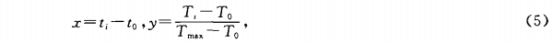 式中:x是歸一化時間,代表階躍信號加入的時間,單位是s;t0是階躍信號加人的時刻;4;是對應溫度T;的時刻;T0是熱電阻的初始溫度;Tmax是傳熱穩定后熱電阻的指示溫度;T;是當前時刻熱電阻指示的溫度;y是歸一化的溫度值。
