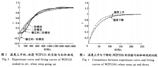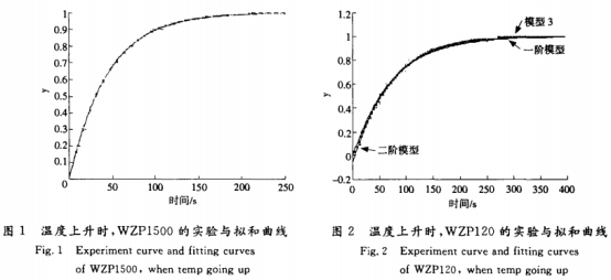 油浸WZP120型中,由于導熱油的存在,只有在導熱油被加熱后,熱電阻才會有響應,因此,造成了較大的熱容性延遲。該系統具有純滯后特性,純滯后的時間大約為150s。在數學模型中,這是不可忽視的因素。用sin(ax-π/2)因子修正的二階模型是最簡單的,但在初始階段,存在不合理的估計值。實際使用時,對于響應為負值的數據可處理為0,作為處理純延遲的方法。要想得到更高的精度,只有采用更復雜的模型,如采用sin(ax-π/2)修正的三階數學模型。