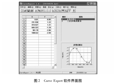 最小二乘法的計算標準是使求得的擬合函數與給出的實際離散點之間的誤差平方和最小。而切比雪夫法的計算標準是使求得的擬合函數與給出的實際離散點之間的誤差最大值為最小。為了便于對比計算,課題應用RADStudio軟件可發出針對兩種擬合方法在不同階次的擬合計算軟件,同時多設置3個變量分別表征d0誤差平方和、d1誤差絕對值和、d2誤差絕對值最大值。下圖1為.軟件的程序界面。CurveExpert1.4是-款專業的曲線擬合軟件如圖2所示,通過它能快速的分析出給定數據最適合何種曲線并推算其函數方程式并及給出數據的標準誤差及相關系數,課題應用CurveExpert軟件對曲線擬合軟件的數據運算進行驗證,以確保多階曲線擬合的正確性。