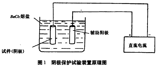 根據電化學腐蝕原理,若以被保護金屬為陰極,另用一金屬作輔助陽極,在兩電極之間施加一個足夠大的直流電場,即構成陰極保護系統,從而可增加被保護金屬的抗腐蝕能力。圖1為陰極保護試驗裝置原理圖。