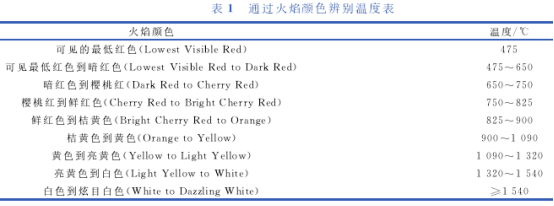 通過窯爐火焰的顏色辨別溫度的經驗如表1所示,顏色辨別溫度僅供參考(經驗證明窯爐的燃燒及火焰.工況各不相同)。