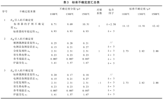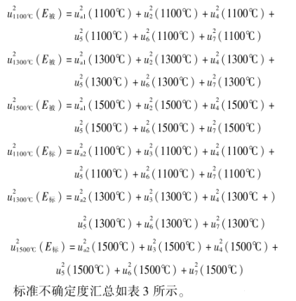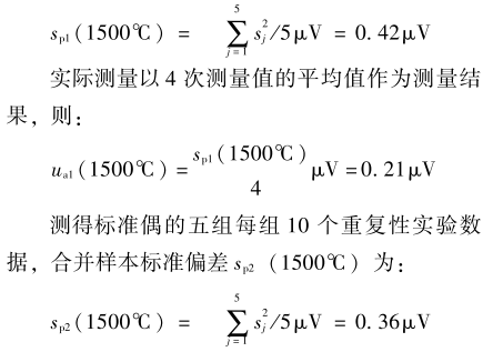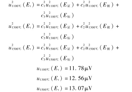 電測設備的測量分辨力為0.1μV,由其引入的不確定度分量ub=0.1μV/23=0.029μV,ub,(1500℃),u2(1500℃)相比很小,ub忽略不計,只考慮重復性引入的不確定度分量。