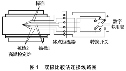 將一等鉑銠30-鉑銠6熱電偶和工作用鉑銠30-鉑銠6熱電偶捆扎后放人高溫檢定爐,采用雙極比較法檢定1100℃、1300℃、1500℃三個溫度點,分別計算算術平均值,得出被檢熱電偶在各溫度點的熱電勢值。雙極比較法的連接線路圖如圖1所示。