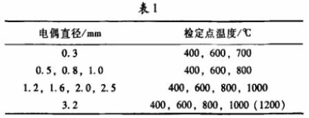 K型熱電偶溫度傳感器,根據JJC351-1996《工作用廉金屬熱電偶檢定規程》的要求,I級熱電偶的允許偏差為±1.5℃或±0.4%t,II級熱電偶的允許偏差為±2.5℃或±0.75%t。K型熱電偶檢定溫度點根據偶絲的直徑不同而有所不同,一般按照表1的要求來確定檢定溫度點。通過測出的實際電勢值與標準熱電偶的電勢值相比較,轉換成溫度的示值誤差即可判斷出該支熱電偶的等級。