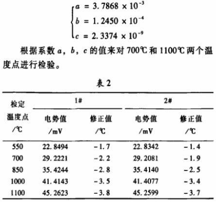 熱電偶現場測得兩個溫度點的電勢值分別為29.2221mV和41.4143mV,利用公式或分度表可以得到其分別對應的溫度為702.20℃和1003.54℃,將換.算后的溫度值代人電勢修正公式得到這兩個點的電勢誤差值,即