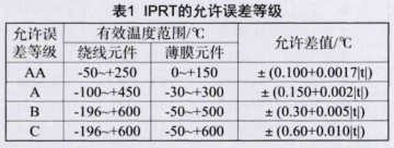 為確保工業鉑熱電阻在實際測溫中的正確性,需要采用專門的IPRT檢定裝置對其進行校驗和評價。IPRT檢定裝置主要由電測儀器、標準鉑熱電阻(SPRT)、恒溫源等設備組成。恒溫源能夠為檢定裝置提供所需的穩定溫度環境;電測儀器用于配合標準鉑熱電阻實現溫度的正確測量;標準鉑熱電阻SPRT是各種標準溫度計和精密儀器檢定中的標準器,主要用于量值的傳遞和高精密測溫,在進行工業鉑熱電阻的檢定時,SPRT的精確性和電測儀器的準確性十分重要,按精度等級來分,可分為基準、一等和二等,按測溫范圍不同,可分為高溫、中溫和低溫三種。我國常見的IPRT分度號為:Pt10、Pt100、Pt1000等等,即標準狀態下0℃時的阻值分別為10Ω、100Ω、1000Ω等。根據JJG229-2010頒布的標準,我國的IPRT按測溫范圍和允許誤差等級可分為四個常見的不同等級,如表1所示。