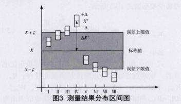 標稱值之差在技術指標要求的允許誤差范圍之內時,則視為合格,反之則為不合格。IPRT檢定時測量真值分布在一定的區間范圍內,并且該區間范圍內不同點的分布概率也不相同,測量結果的可能分布區間如圖3所示。