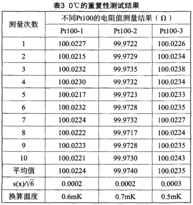 采用三支不同的Pt100進行多次重復性測試,以s(x)表示測量結果的標準偏差,其在0℃和100℃時的電阻值測量結果如表3和表4所示。