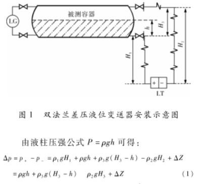 零點漂移△Z具體包括:由雙法蘭膜片接觸不同的介質(被測容器內液體與液體上部的氣體)所產生的溫度差造成的雙法蘭差壓液位變送器零點漂移;由于環境溫度對毛細管內硅油的影響所引起的雙法蘭差壓液位變送器零點漂移;由于安裝引起的雙法蘭差壓液位變送器零點漂移;其他原因引起的雙法蘭差壓液位變送器零點漂移。