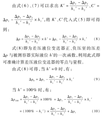 其中,△p0,△p100分別為雙法蘭差壓液位變送器的正確零點和量程。將差壓液位變送器的零點和量程分別調整為△p。、△p100,則變送器的指示值與被測容器上的就地液位計指示值在整個測量范圍內完全一致。