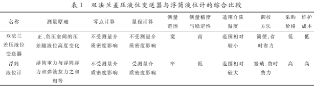 綜上,雙法蘭差壓液位變送器的測量精度高于浮筒液位計,雙法蘭差壓液位變送器的測量介質溫度適用范圍小于浮簡液位計,雙法蘭差壓液位變送器的穩定性遠高于浮簡液位計。