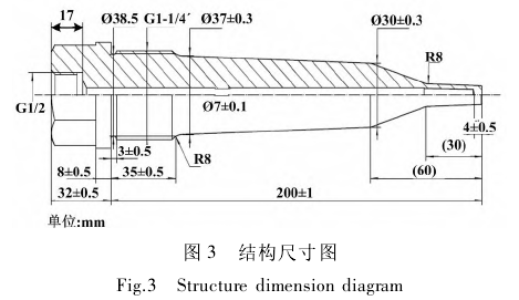 采用Ansys-Fluent軟件,基于計(jì)算流體動(dòng)力學(xué)(computational fluid dynamics,CFD)方法進(jìn)行仿真分析,通過(guò)計(jì)算機(jī)數(shù)值求解流動(dòng)和傳熱方程,對(duì)包含流體流動(dòng)和熱傳導(dǎo)等相關(guān)物理現(xiàn)象的系統(tǒng)進(jìn)行分析。熱電阻溫度計(jì)套管的基本結(jié)構(gòu)尺寸如圖3所示。