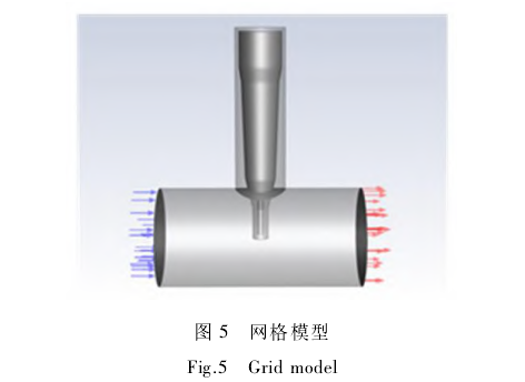 Fluent軟件中,體網(wǎng)格劃分有四面體網(wǎng)格和六面體網(wǎng)格兩種方式。本次仿真采用的網(wǎng)格劃分方式為適應(yīng)性較強(qiáng)的四面體網(wǎng)格。對(duì)DN100仿真模型采用非結(jié)構(gòu)化網(wǎng)格劃分,即四面體網(wǎng)格劃分。網(wǎng)格模型如圖5所示。