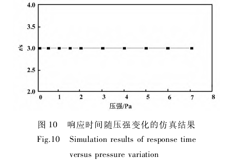 由圖10可知,響應(yīng)時(shí)間隨著壓強(qiáng)增加不發(fā)生變化。其原因在于水作為不可壓縮流體,其物性參數(shù)基本不隨壓強(qiáng)增加而產(chǎn)生變化。