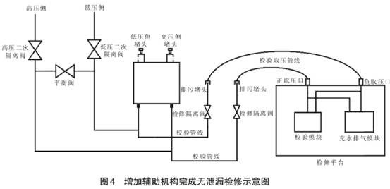 在不拆除儀表管線的情況下,通過設置檢修接口或者輔助結構,實現了檢修平臺與差壓變送器高、低壓側密封連接,再通過連接檢驗取壓管線完成介質導出或者充入以及校驗壓力的給入,實現了變送器檢修過程的無泄漏控制。