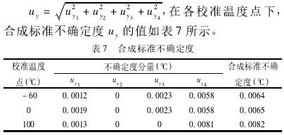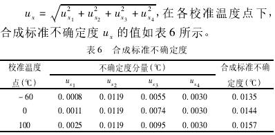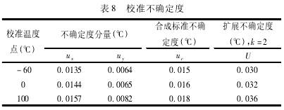 在獲得被檢傳感器引入的合成標準不確定度ux及標準器引入的合成標準不確定度uy后,各溫度%校準點的校準不確定度如表8所示。