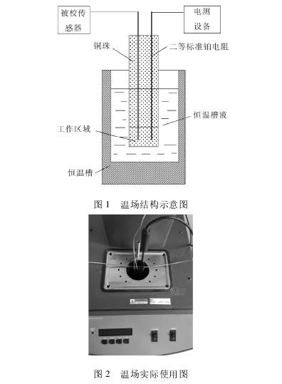 熱電阻溫度傳感器的校準主要通過恒溫槽提供溫場,可將傳感器直接浸入槽液中,亦可將其置于玻璃套管中插入槽液中。使用此類溫場時,會造成傳感器和槽液相互污染或需大量時間使傳感器讀數達到穩定的情況。本文通過使用內部空間較大的不銹鋼套管替代常規使用的細長玻璃套管,并在不銹鋼套管中注滿小銅珠,重新構建一個到溫速度快且不易污染感器的均勻溫場,并對其在不同校準溫度點的溫度均勻性及溫度波動性進行研究。實驗結果顯示,此溫場技術指標滿足熱電阻傳感器的校準要求。