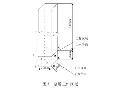 由于新型溫場套管深度達到450mm,浸入液面下深度為420mm,為使校準時的溫場盡可能的穩定可靠,達到進行熱電阻傳感器校準時的溫場標準,需確定一個有效的溫場工作區域。且由于工作中需進行校準的各類熱電阻傳感器長短不一,最長的熱電阻傳感器可達到100mm,故選取套管底部30mmx30mmx120mm區域作為工作區域。溫場的工作區域如圖3所示。