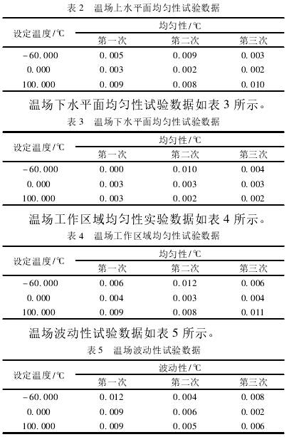 溫場性能的測試通??梢允褂脴藴抒K電阻溫度計及標準玻璃液體溫度計進行,本文參考JJF1030-2010《恒溫槽技術性能測試規范》中的測試方法,5選用標準鉑電阻溫度計對溫場性能進行測試。對新型溫場中的水平溫場、垂直溫場、波動性等相關參數指標進行了測試。根據JJG229-2010《工業鉑、銅熱電阻檢定規程》中的要求及實際使用需求,測試溫度點為-60℃、0℃、100℃。