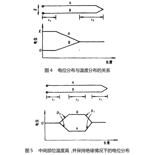 同理,當中間部位溫度較高時在熱電偶偶絲之間保持絕緣的條件下,其電位分布如圖5所示。這種場合中,由于中間部位溫度高,且有溫差存在,熱電偶絲間必將產生電位差。