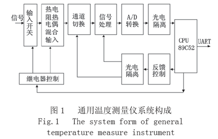 圖1為通用溫度測量儀的硬件框圖,輸入為8個通道,通過繼電器控制選擇前置處理電路,8通道測量共用信號調理電路,通道切換采用電子開關:為適應輸入信號變化范圍和提高測量精度,信號放大電路采用可變增益運放,A/D轉換采用14位雙積分型器件,輸入輸出采用隔離措施提高抗干擾性;微控制器選用89C52,它具有獨立的信號采集及數據處理能力,通過異步串行口接受采樣命令和發送采樣值[2]。