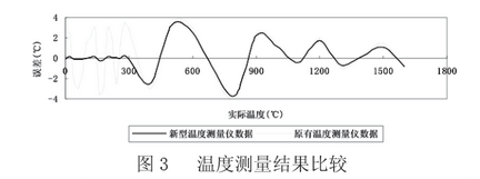 S型熱電偶。將此種新型測溫儀的測量結果與現有的陶瓷窯爐測量數據進行比較,結果如圖3所示,在300℃以下最大誤差為0.22℃,大部分溫度測量誤差在0.20℃以內;300℃以上測量誤差在3.5℃左右,測量精度高于一般的陶瓷窯爐溫度測量儀,尤其在低溫段特別明顯。